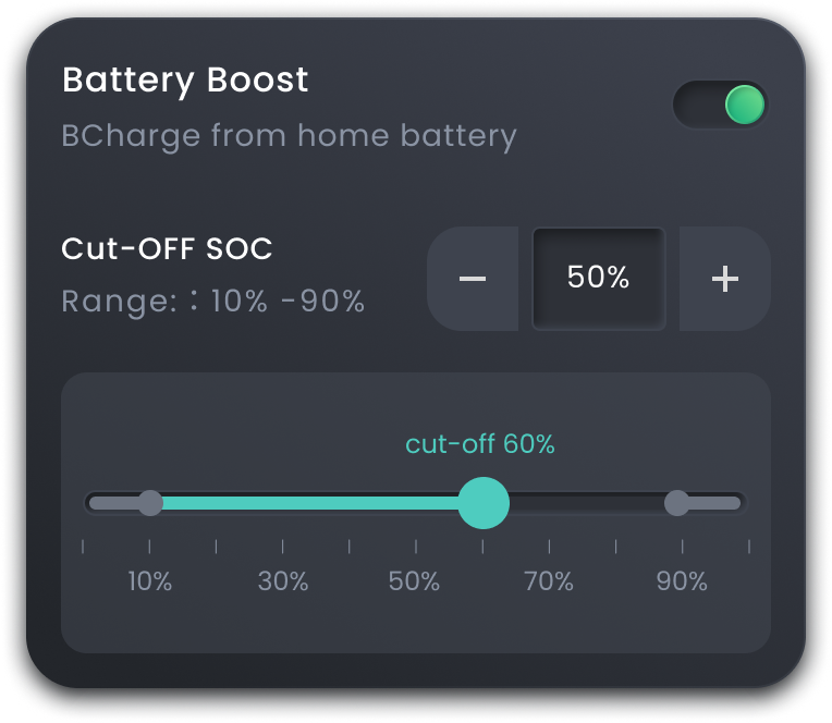 Gebruik de thuisbatterij om de laadsnelheid van electrische voertuigen te verhogen met extra energie. Stel de uitschakeltijd in voor intelligent stroomverbruik.